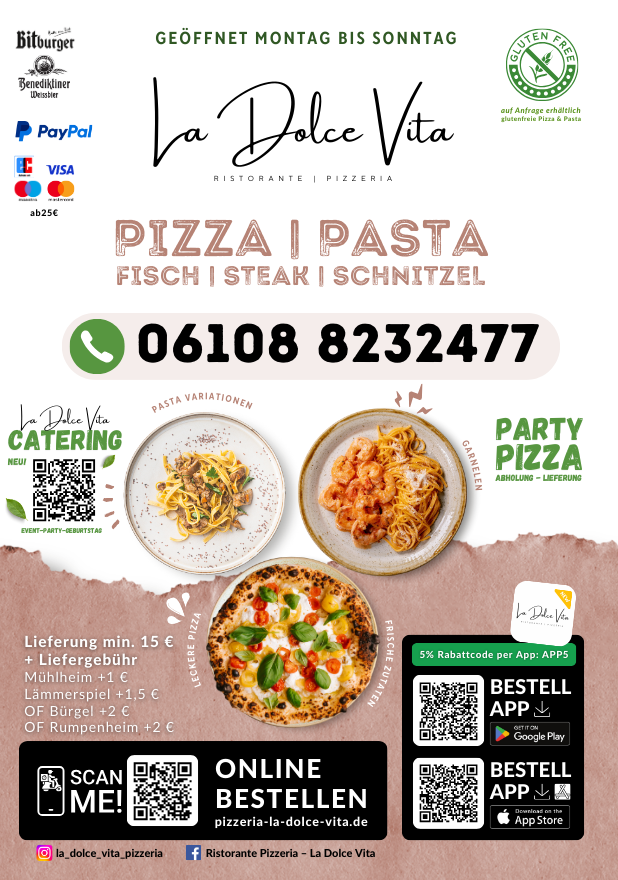 Tauchen Sie ein in die Welt der italienischen Küche und lassen Sie sich von unserem vielfältigen Angebot begeistern! Bei uns im La Dolce Vita erwartet Sie eine kulinarische Reise, die Ihre Sinne verzaubern wird. Entdecken Sie unsere umfangreiche Speisekarte, die alles bietet, was das Herz eines Italienliebhabers höher schlagen lässt. Von knusprigen Pizzen über frisch zubereitete Pasta bis hin zu zarten Fleisch- und Fischspezialitäten – bei uns finden Sie die besten Gerichte Italiens. Besonders empfehlen möchten wir unsere italienischen Tapas: Kleine, feine Köstlichkeiten, die perfekt zum Teilen oder als köstlicher Einstieg in Ihr Menü geeignet sind. Ob im Restaurant oder bequem von zu Hause aus – unser Lieferservice bringt Ihnen die Aromen Italiens direkt an die Tür. Genießen Sie unsere Speisen in Mühlheim, Lämmerspiel, Dietesheim, Offenbach Bürgel und Offenbach Rumpenheim. Lassen Sie sich von unserem erstklassigen Service und der Qualität unserer Gerichte überzeugen!