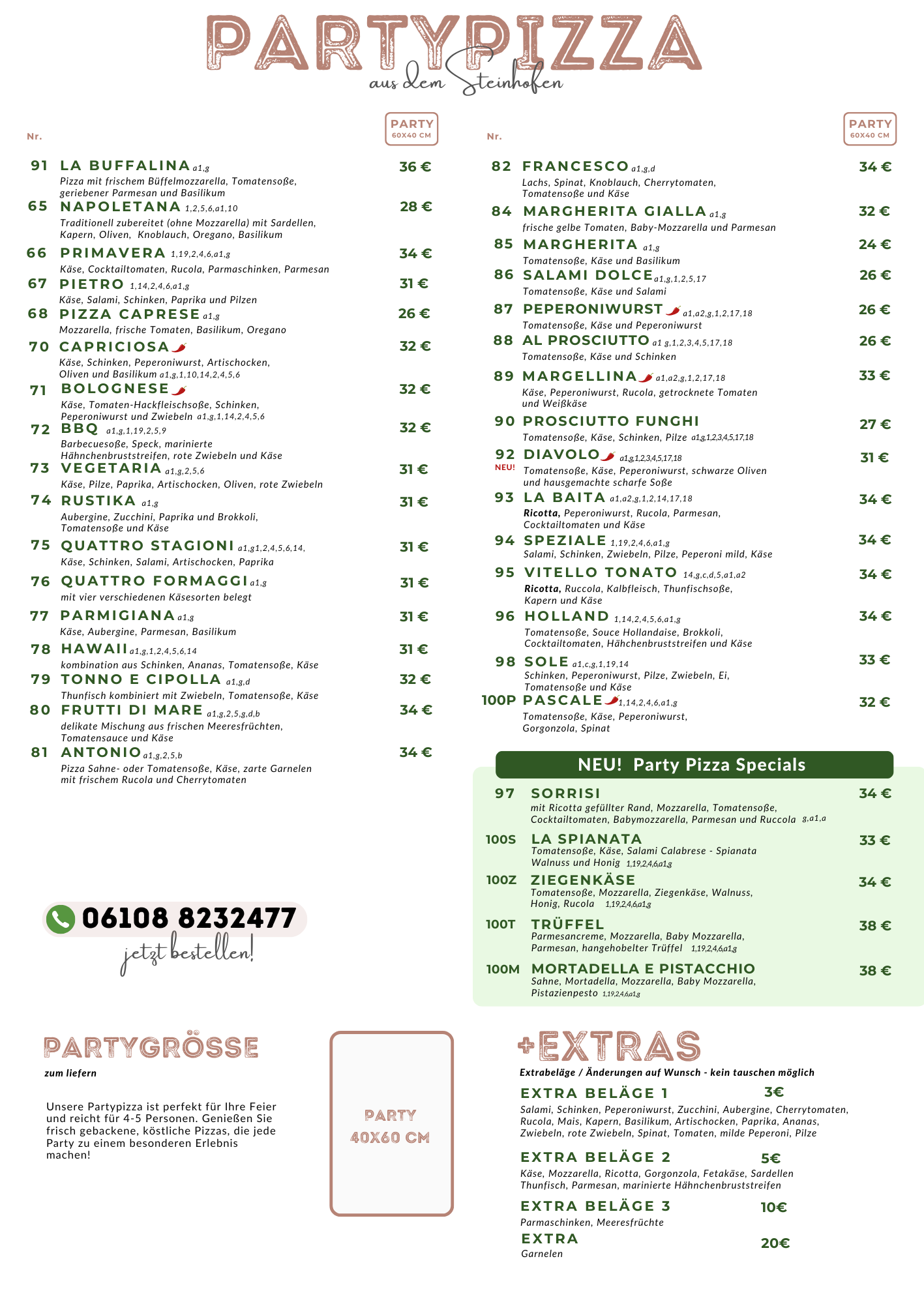 frisch belegt, knusprig aus dem Steinofen und mit hausgemachtem Pizzateig. Unsere großzügige 60×40 cm Pizza ist perfekt für 4-5 Personen und eignet sich ideal für Gartenpartys, Geburtstage, Kindergeburtstage, Polterabende, Firmenfeiern und viele weitere Anlässe. Bestellen Sie bequem online zum Lieferdienst oder holen Sie Ihre Pizza direkt bei uns ab und genießen Sie authentischen italienischen Geschmack bei Ihnen zu Hause!